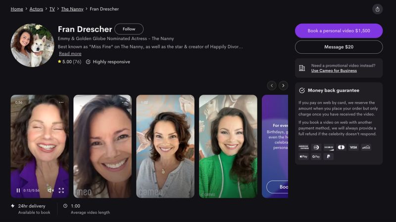 Even SAG-AFTRA President Fran Drescher, who created and starred in the ’90’s sitcom “The Nanny,” reactivated her account this week, Cameo said. Drescher charges $1,500 for a video.